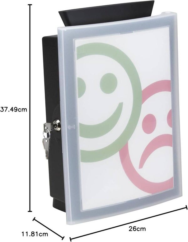 Multifunctionele Verzamelbox met Transparante Afsluitbare Deur en Verwisselbaar Motief - (DIN A4) Geschikt als Stembus, Dispenserbox of Actiebox - Voor Wandmontage of Vrijstaand met Poten - Zwart